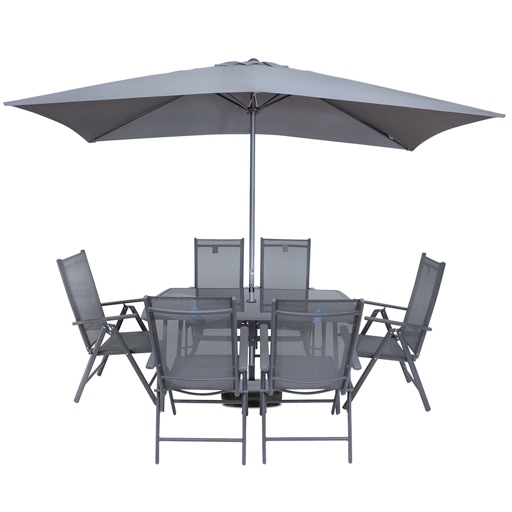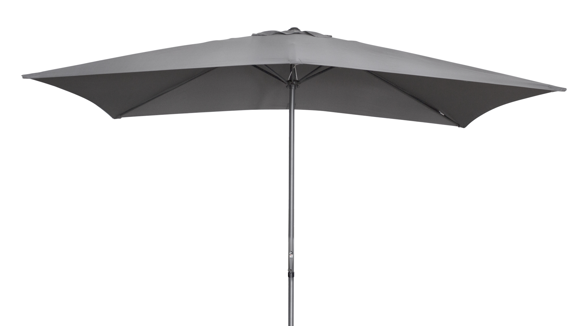 - Sombrilla rectangular 3 x 2 m poste central de aluminio de 38 mm con polvo anticorrosivo, varillas de acero con polvo anticorrosivo color gris oscuro tela poliéster de 180 gr.